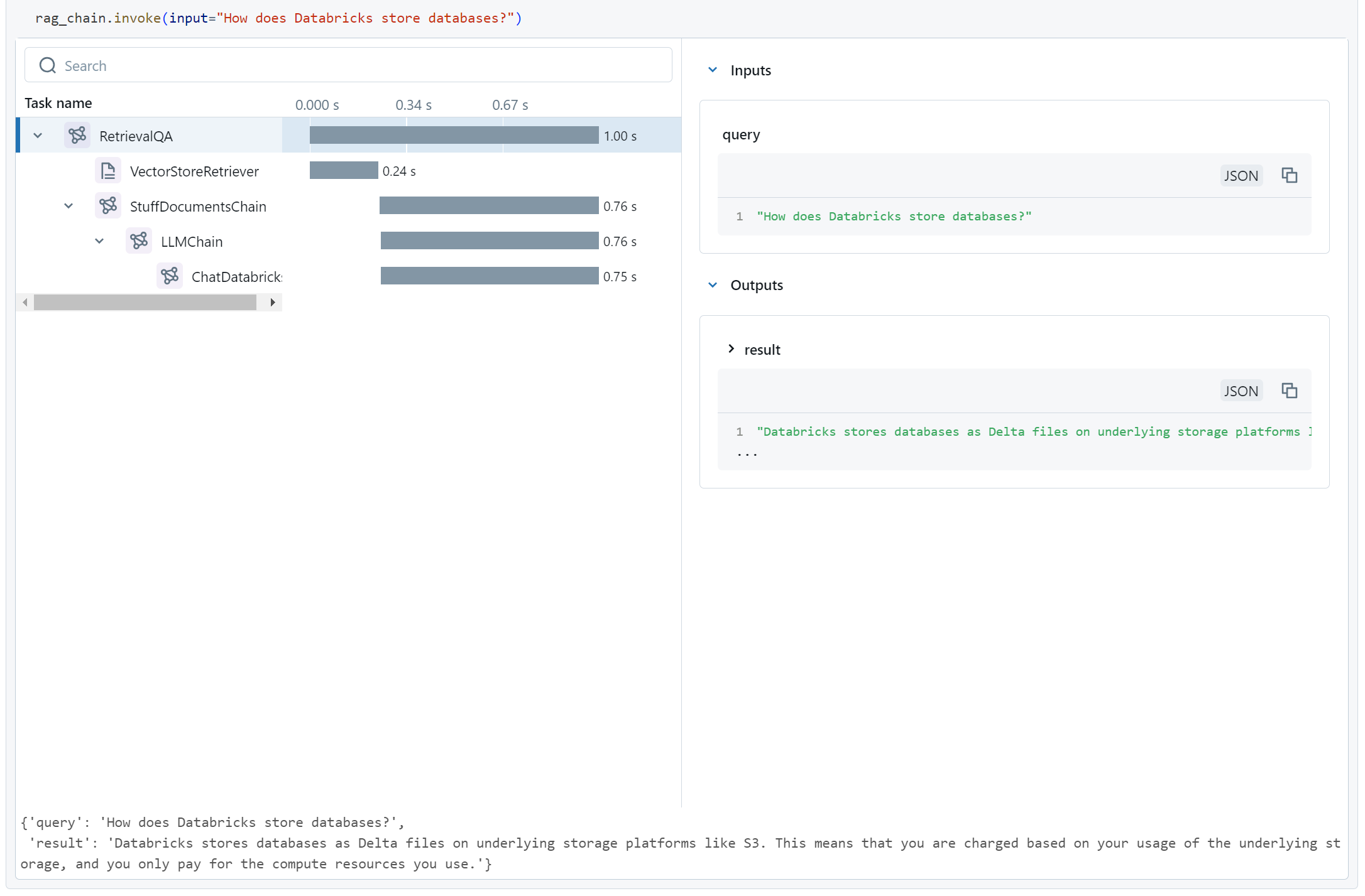 When we run this, MLFlow Tracing tracks how all the components of our chain invoke each other, and what their inputs and outputs are. It stores this data in a resilient location, but also conveniently displays it right away for us.